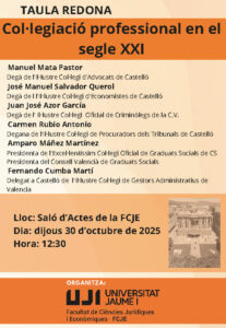 Mesa Redonda: «Colegiación profesional en el siglo XXI», Organiza Universidad Jaume I de Castellón, Factultad de Ciencias Jurídicas y Económicas, participa el Ilustre Colegio Oficial de Criminólogos de la Comunidad Valenciana.